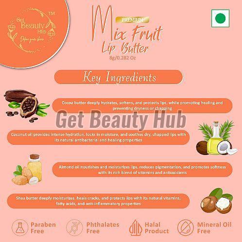 Get Beauty Hub Lip Butter in Mixed Fruit Flavor is the one solution for attaining soft, smooth, and nourished lips. Made with natural and organic ingredients, this rich and creamy mixed fruit lip butter deeply hydrates and repairs dry, chapped lips, leaving them feeling irresistibly soft with the best internal lip care material. Infused with the goodness of fruit extracts, it provides moisturized lips while protecting your lips from harsh weather conditions.